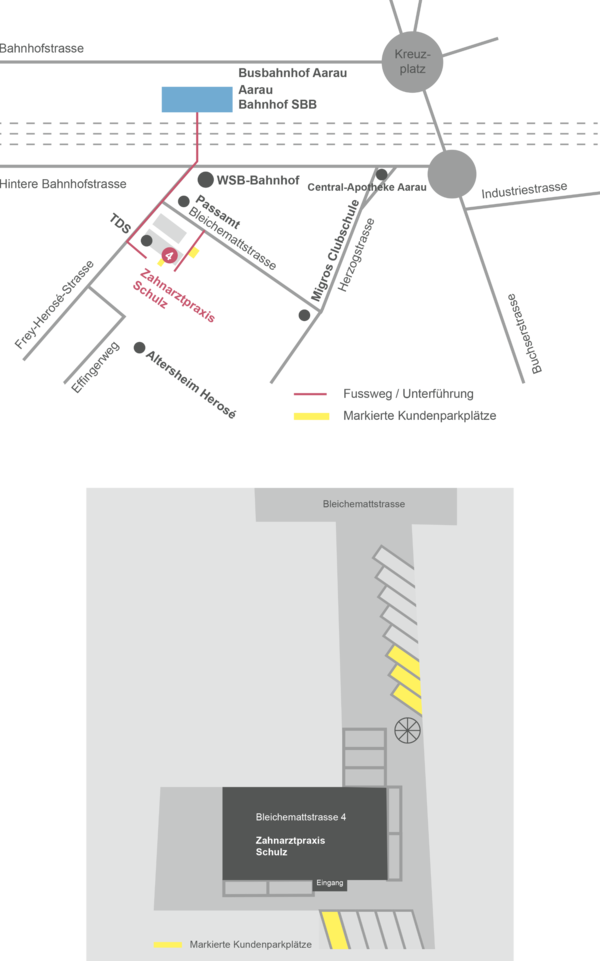 Unsere Zahnarztpraxis ist in unmittelbarer Nähe des Aarauer Bahnhofes situiert. Sie ist daher mit den öffentlichen Verkehrsmitteln (Bus, SBB oder WSB) vom Bahnhof Aarau aus bequem zu Fuss zu erreichen (max. 200m).